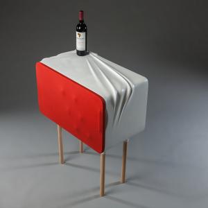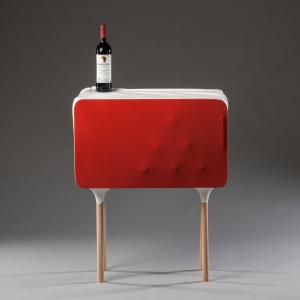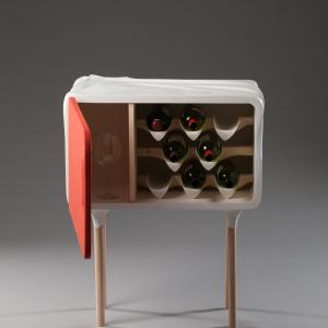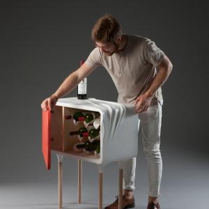 La mini cantina per vini può contenere fino a 8 bottiglie e 6 bicchieri. La porta è composta da una cornice di legno ricoperta di un panno elastico. Quando la porta è chiusa, il telaio spinge il panno contro le bottiglie, che deforma la superficie e comunica all’utente quante bottiglie ci sono dentro senza nemmeno aprire la porta. La parte superiore dell’armadio ha un segnaposto per una bottiglia implicita con una trama che imita un panno spiegazzato fresato nel materiale duro.